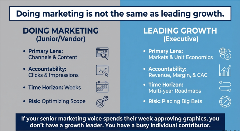 If you’re spending $500K–$5M annually on marketing and your return is opaque, the cost of not having a senior owner isn’t measured in hundreds of thousands. It’s measured in millions of foregone growth.